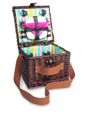 LIMITED EDITION – If you are out to impress on a romantic picnic for 2 then make sure you are equipped with one of these beautifully designed limited edition wicker picnic hampers from Wilson & Co. The hamper is made from willow wicker, which has been hardened to withstand the riggers of many years of use. Complete with printed cotton lining and a shoulder strap this hamper includes: